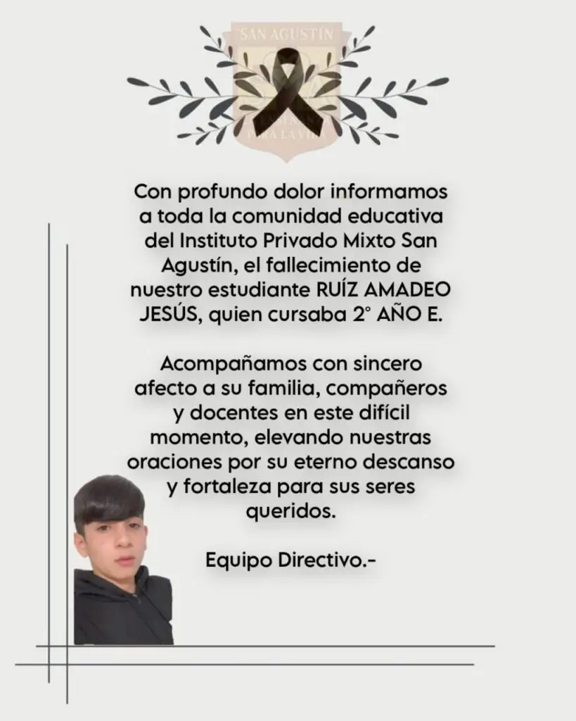 Comunicado “Concedele, Señor, el descanso eterno y brille para el la luz que no tiene fin” Posted on 12 septiembre, 2025 by Santiago ✝️Estimada Comunidad Agustiniana, les comunicamos que Nivel Secundario no tendrá actividad debido al duelo por el estudiante Ruiz Amadeo Jesús. 🙏🏻 Confiamos en sus oraciones para acompañar a los miembros de la Familia de Amadeo.