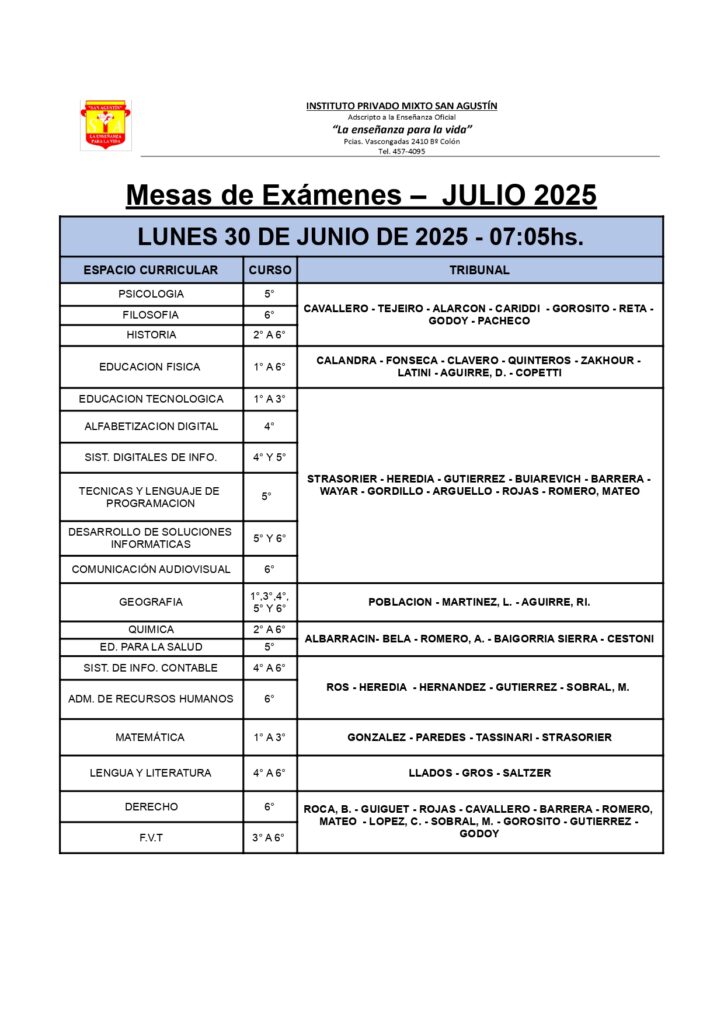 El Instituto Privado Mixto San Agustín comunica que ya están definidas las fechas de los exámenes de julio de 2025 para estudiantes y exestudiantes que adeudan asignaturas.